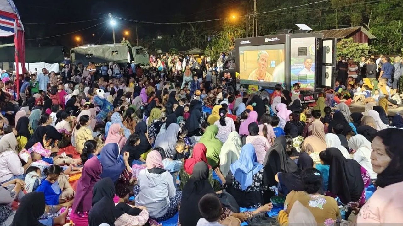 Tanpa kembang api atau pesta meriah, kebersamaan justru menjadi inti perayaan. Layar sederhana dipasang di sudut posko, tikar digelar, dan warga berkumpul sambil membawa camilan seadanya.